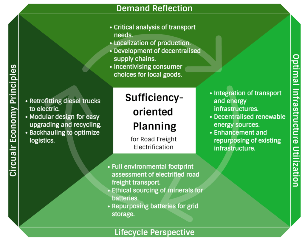 We are happy to see insights from this project published in Energy Research and Social Science. In this publication, our junior researcher Sophie-Marie Ertelt argues that the current “predict and provide” planning approach for road freight transport electrification in the European Union is insufficient for achieving net-zero emissions. She critiques this traditional method for its oversimplification of transport electrification as merely a drivetrain substitution, which neglects the complexities and intrinsic issues of transport demand and its broader environmental impact. She advocates for a shift towards “sufficiency-oriented planning,” emphasizing a more holistic consideration of transport needs within ecological limits and the interconnected challenges between transport and energy systems that arise when electrifying Europes truck fleet.
