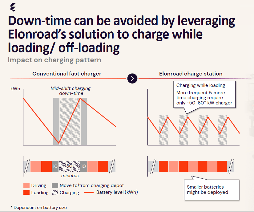 This workshop served a dual purpose: first, to see the area where the proposed charging ecosystem would first be tested in real-life application together with understanding the spatial and operational parameters and limitations. Second, we discussed the technological specifications of the charging solution, including its placement within the area. Toby and Archi from Elonroad presented the parameters of their proposed flexible charging solution. We liked the idea on the following picture – with flexible charging when loading and unloading vehicles, the total battery capacity can be smaller to achieve the same range. If applied to the whole fleet, this could lead to overall more efficient and less resource intensive on heavy metals and chemicals.