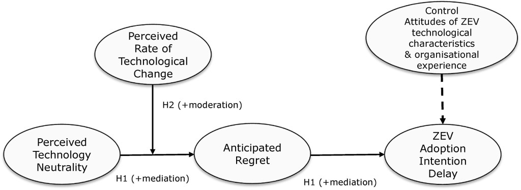 We based our study on a national survey (with 155 participants) of Swedish transport operations managers of haulier companies, incorporating concepts from psychology and consumer marketing. In short, we study how Perceived technological neutrality affects Anticipated regret (emotional response to potential future loses coming from a decision), and subsequent decision to delay a ZEV Adoption (and we also take into consideration how the individual perceives the rate of technological change).