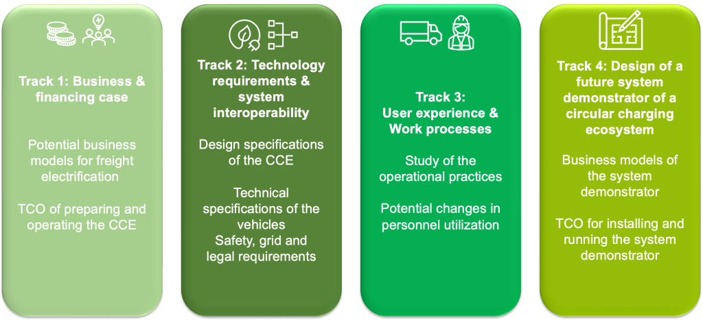 CIRC-s is structured into four interconnected research tracks and each track addresses specific aspects of the transition to electrified freight transport, from business models and technological specifications to user experiences and systemic design.